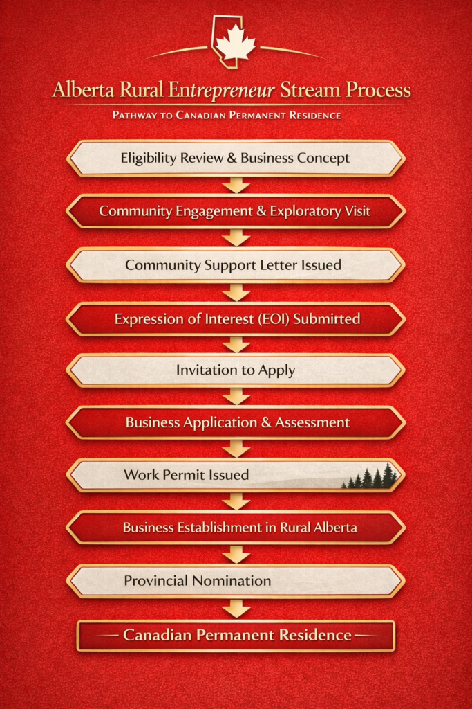 The Alberta Rural Entrepreneur Stream is a staged, business-driven immigration pathway designed to guide qualified entrepreneurs from initial planning through to Canadian permanent residence in a structured and transparent manner. The process begins with an assessment of the applicant’s background, investment capacity, and proposed business concept to ensure alignment with program requirements and the needs of rural Alberta communities. Applicants then engage directly with eligible rural communities to present their business idea and, where supported, obtain a Community Support Letter confirming local endorsement.